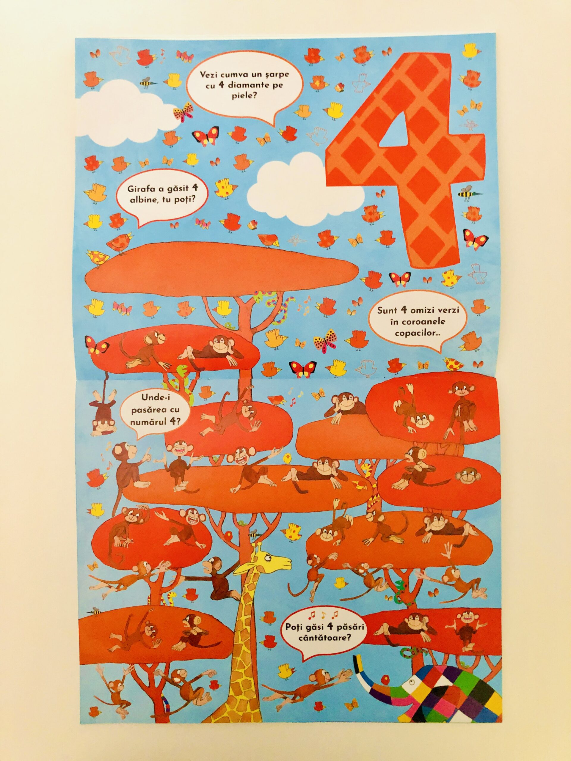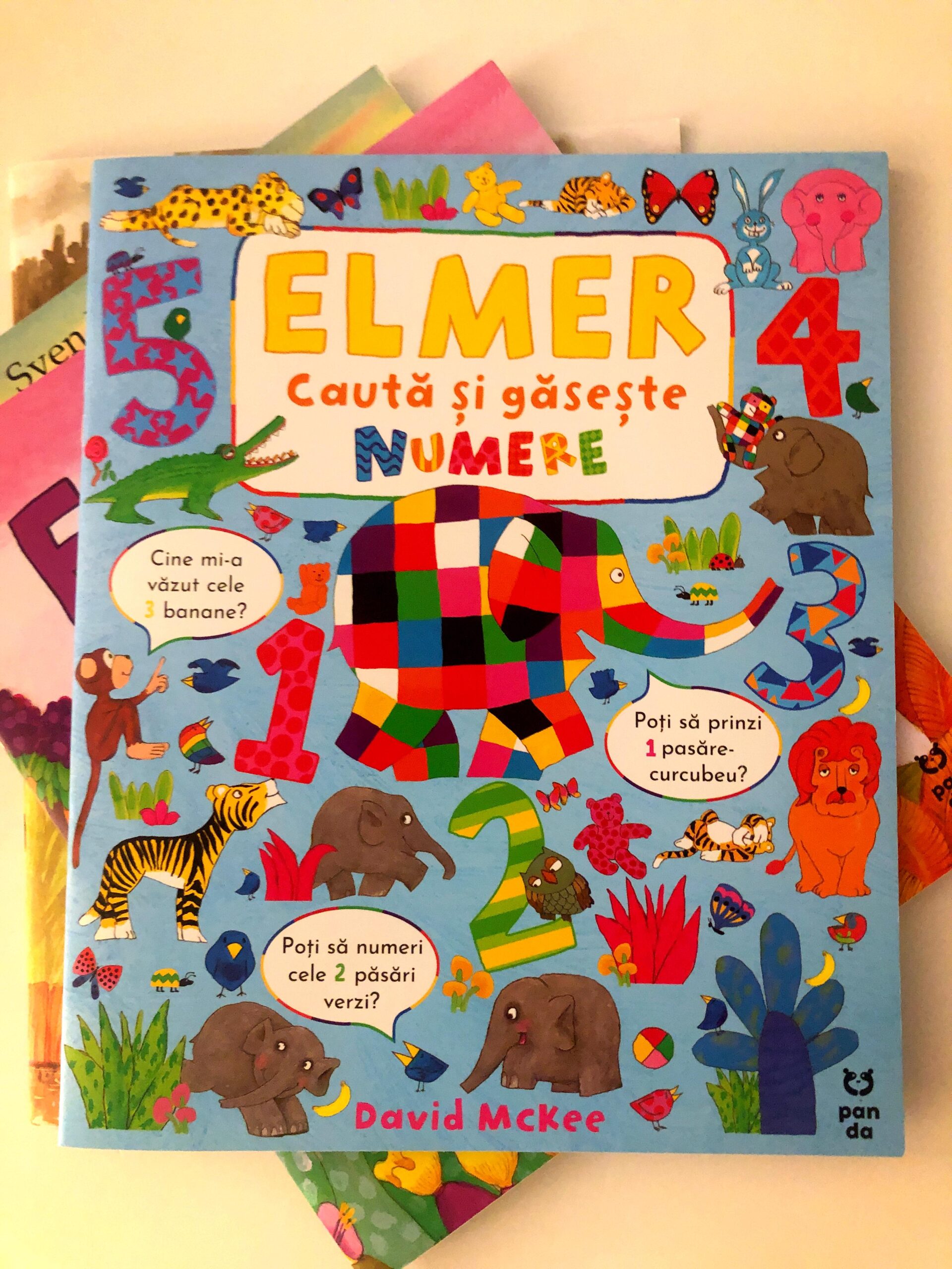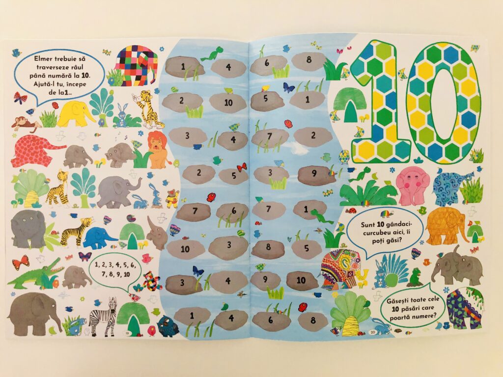Cartea a doua, Elmer caută și găsește numere, este ceva mai specială. Nu are o poveste propriu-zisă, cu eroi și întâmplări. În paginile ei pline de zeci de detalii, copii sunt invitați să găsească numere, animale, fructe etc… toate bine ascunse. Inițial, am crezut că o să fiu destul de apelat de piticii mei să găseasc ce trebuie găsit. Dar nu a fost așa. Doar le-am citit ce trebuie să facă și apoi piticii aproape că nici nu m-au băgat în seamă. Au început să exploreze fiecare pagină, fiind extrem de mândri atunci când reușeau să găsească tot.