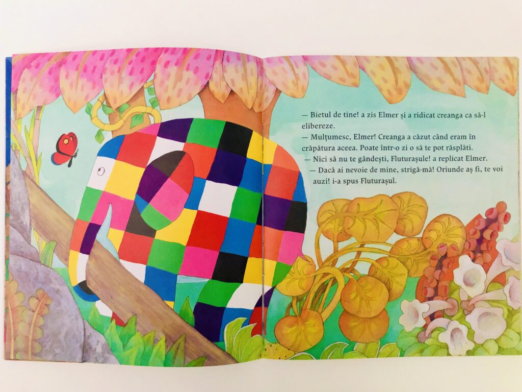 Elmer și fluturașul este o poveste clasică, semnată David McKee, în care Elmer salvează un fluturaș, iar acesta îi promite că îl va răsplăti. Cum? Nu spun. Dar ce pot spune este că Elmer arată exact cum desenez eu un elefant, deci cartea este perfectă și pentru mine. În plus povestea este minunată și foarte, foarte, foarte colorată. În plus, cartea a avut succes nu numai datorită culorilor vii, ci și datorită aventurilor prin care trece elefantul multicolor și a prieteniei dintre el și fluturașul de pe copertă.